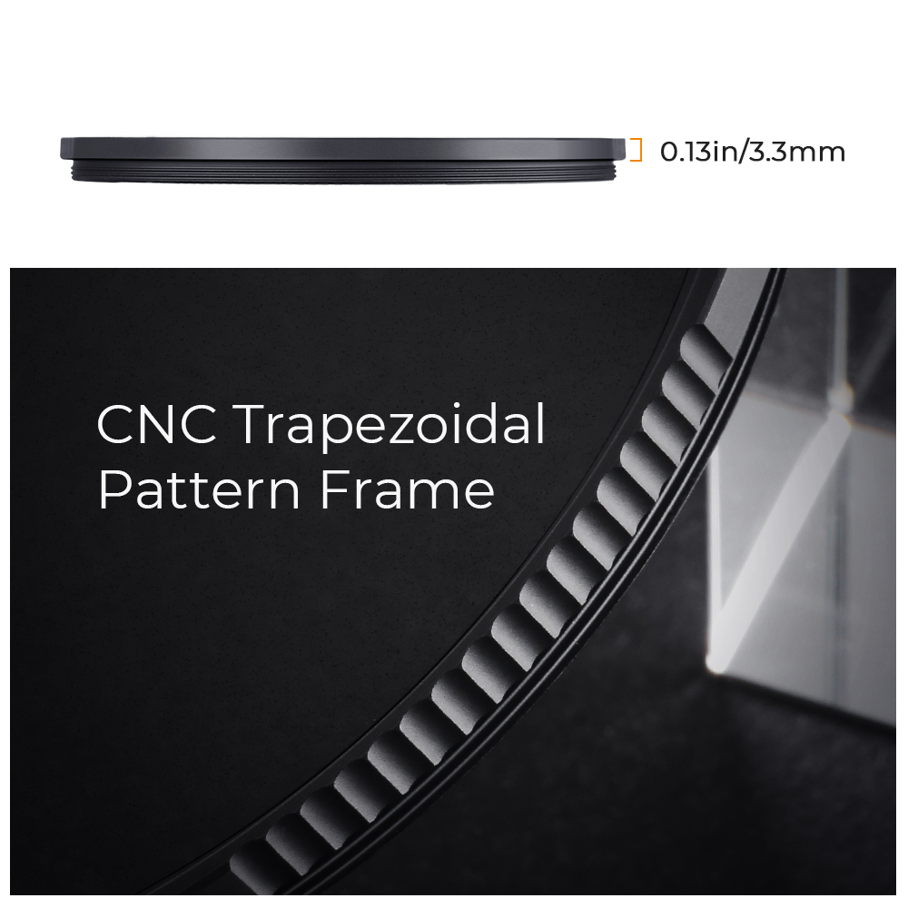 With Aviation grade aluminum,the width of frame measures only 3.3mm, ultra slim frame no dark corners and vignetting on wide angle and long focal lens. CNC system provides exquisite curve on frame,extra friction and antiskid.