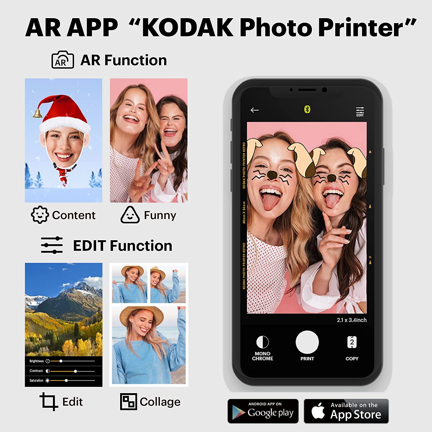 AR APP – Download the KODAK Photo Printer application to print anywhere and anytime. You can use the fun augmented reality features and other decorative functions like beauty, filters, frames, and more.