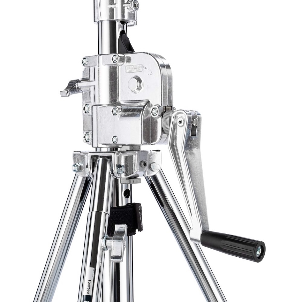 Augstas veiktspējas tērauda gaismas statīvs ar tērauda Wind Up pacelšanas mehānismu.Tas nodrošina 45 kg maksimālo kravnesību ar maksimālo darba augstumu līdz pat 261 cm. Statīva pamatnes balsts aprīkots ar 75 mm fiksējamiem ritenīšiem. Rekomendētie papildus aksesuāri: E200, D600, D650, 425B, G200-1