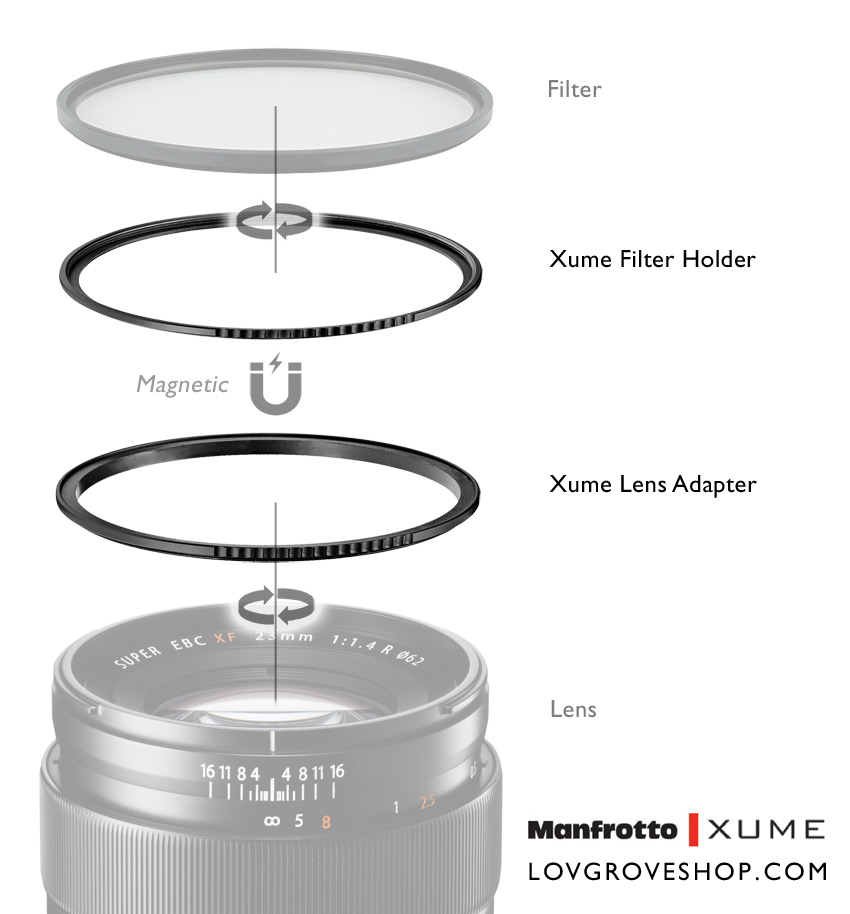 Manfrotto XUME sistēma sastāv no 2 sastāvdaļām – filtra turētāja un objektīva adaptera. Objektīva adapters tiek uzskrūvēts uz objektīva, bet filtra turētājs tiek uzskrūvēts uz filtra. Pateicoties savstarpējam magnētismam, šīs daļas ir iespējams viegli un ātri savienot, un atvienot, ja nepieciešams, tādā veidā izvairoties no stresa pilnās uzskrūvēšanas un noskrūvēšanas.